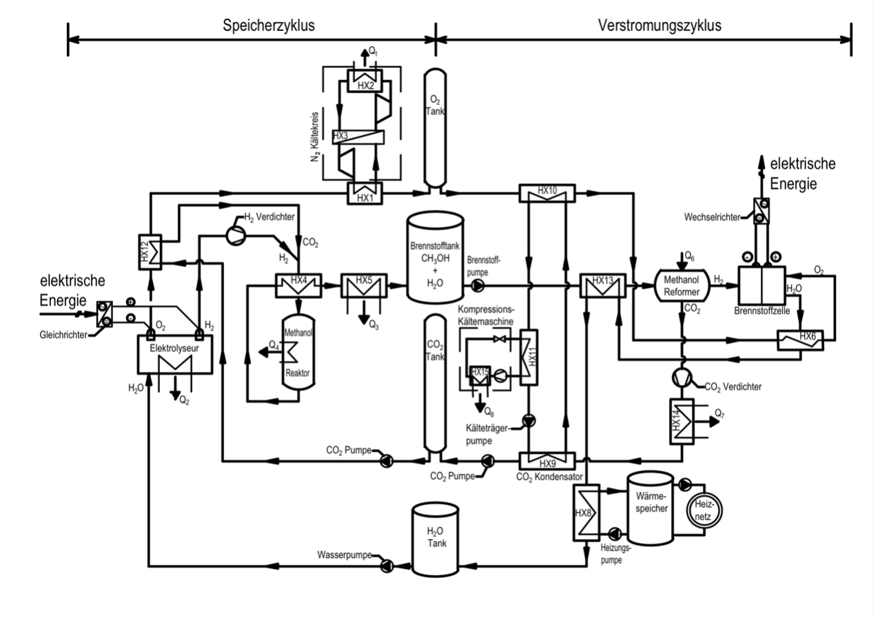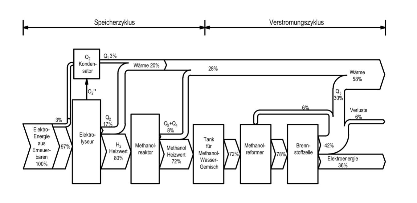 - dem Verstromungszyklus, in dem bei Unterversorgung im Stromnetz das eingelagerte e-Methanol in indirekten Methanol-Brennstoffzellen (engl. Reformed Methanol Fuel Cell RMFC) zur Elektrizitätserzeugung genutzt wird.