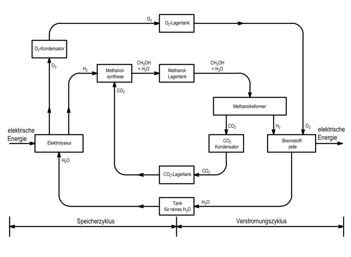 Geschlossener Stoffkreislauf des Methanol-Brennstoffzellen-Speicher-Kraftwerks