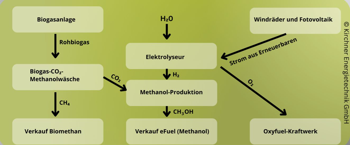 - Der Methanol-Produktion mit dem H₂ aus der Elektrolyse und dem CO₂ aus der Biogasanlage