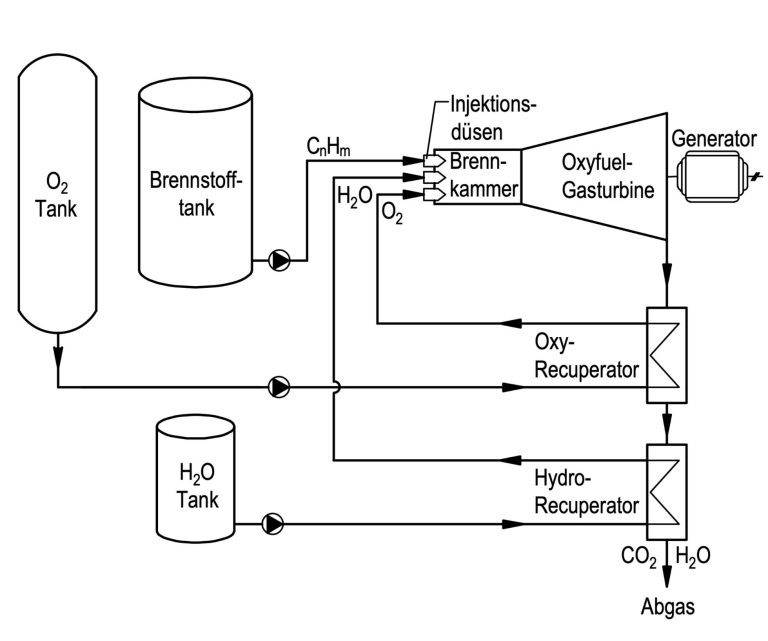 - Einem Oxy-Recuperator zur Nutzung der Enthalpie des expandierten Gasgemischs für die Erwärmung des zugeführten O₂. Der Verbrennungsdruck >60 bar liegt oberhalb des kritischen Drucks des O₂ von 50,9 bar. Die Verdichtung des O₂ mit einer O₂-Pumpe verläuft bei der Lagertemperatur des O2 < -130 °C aus der flüssigen Phase in die Phase eines überkritischen Fluids mit hoher Dichte und geringer Kompressibilität. Bei Erwärmung über die kritische Temperatur des O₂ von – 118 °C (das O₂ wird der Brennkammer mit ca. 500 °C injiziert) ändern sich die Stoffeigenschaften zu denen eines Gases (niedrige Dichte und große Kompressibilität) ohne Phasenänderung.