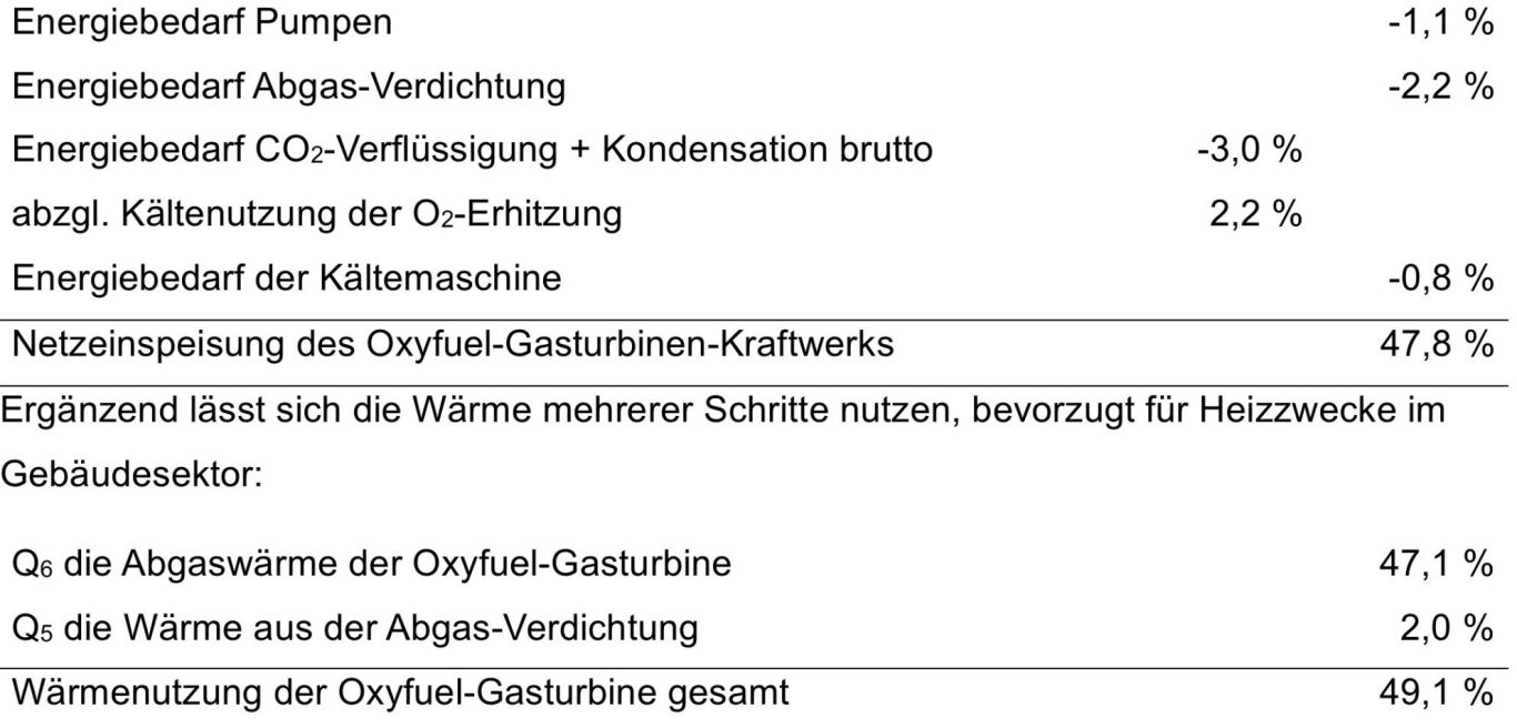 Von diesem elektrischen Wirkungsgrad muss zur Berechnung der Netzeinspeisung der Energieaufwand für die Pumpen, die Abgas-Verdichtung und die CO₂-Verflüssigung abgezogen werden: