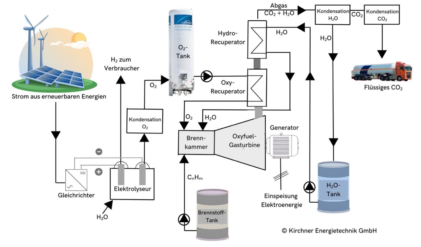 In der Oxyfuel-Gasturbine (aus Oxy für Oxygen (Sauerstoff) und fuel für Brennstoff) wird, im Gegensatz zur konventionellen Gasturbinen, der Brennstoff in der Brennkammer nicht mit Luft sondern mit reinem Sauerstoff verbrannt. Statt der Begrenzung der Temperatur in Brennkammer und Turbine durch eine Verbrennung mit Luftüberschuss, wird bei der Oxyfuel-Gasturbine mit Recuperatoren zur Temperaturbegrenzung auf überkritischen Druck verdichtetes H₂O eingesetzt. Dadurch besteht das Abgas bei der Oxyfuel-Gasturbine ganz überwiegend aus CO₂ und H₂O mit sehr kleinen Anteilen anderer Gase, wie O₂ und CO. Aus diesem CO₂ /H₂O-Abgasgemisch lässt sich durch Kondensation des H₂O leicht reines CO₂ herstellen.